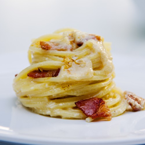 - While the spaghetti is cooking chop the bacon into small pieces.